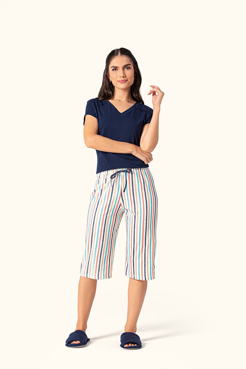 Esse pijama com blusa em viscose canelada marinho com decote V compõe um look moderno com calça pescador com listras coloridas.
