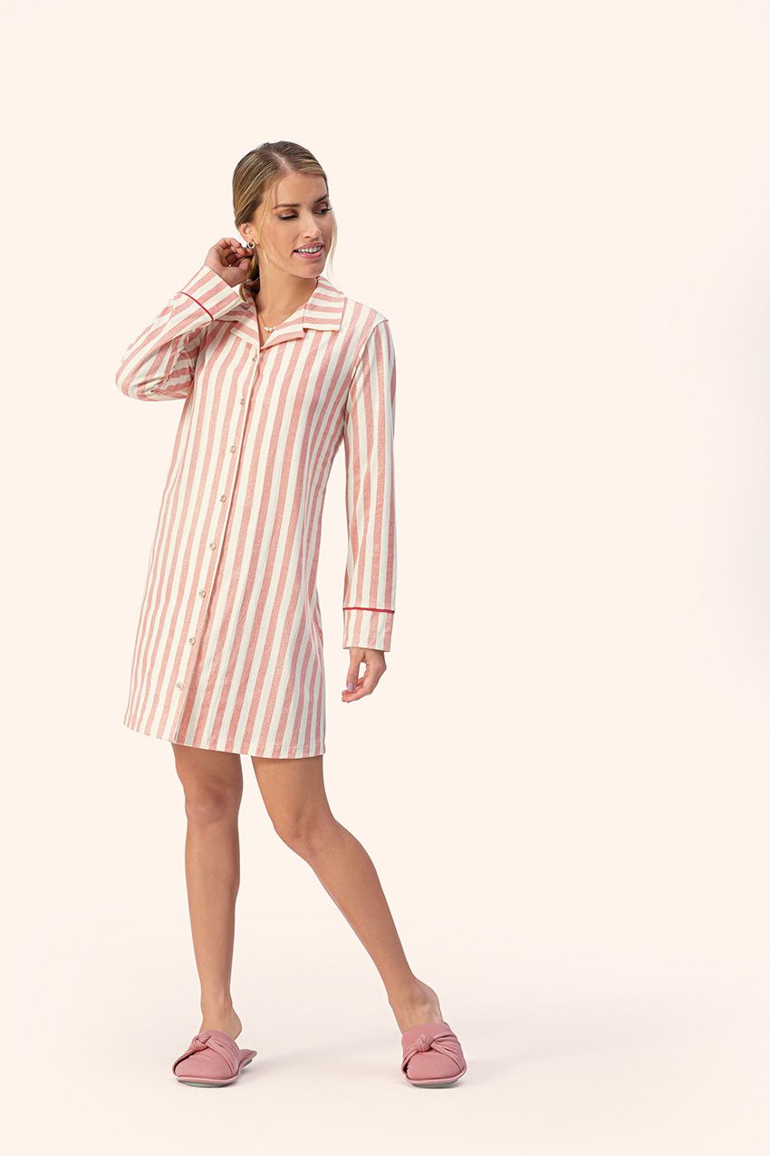 Camisão de manga longa listrado na cor palha e rosa queimado, em 100% algodão, tem o comprimento necessário para se abrir uma porta sem passar vergonha, é uma peça prática e elegante.