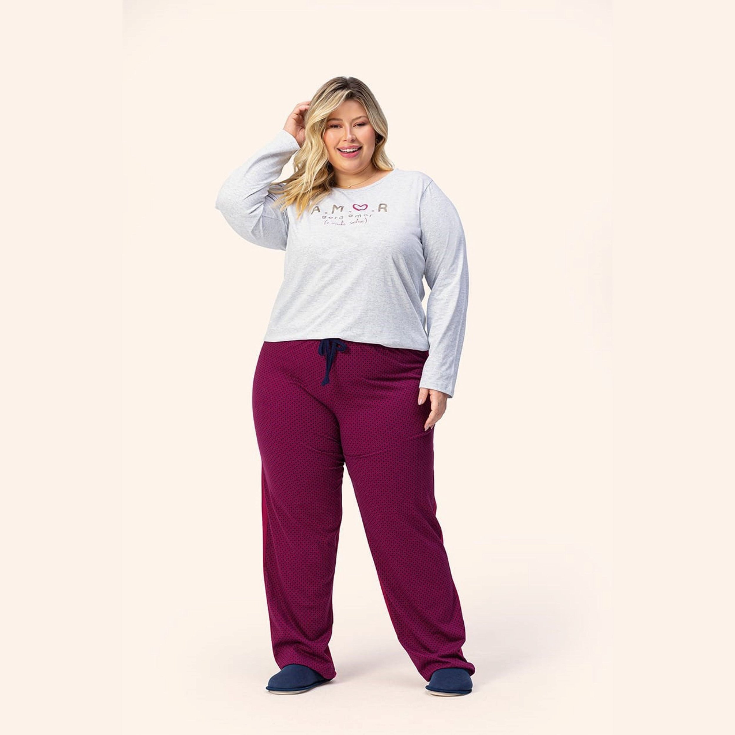 Pijama Lua Encantada manga longa plus size, seu toque é super macio, leve e confortável, com modelagem tradicional. A blusa cinza com decote redondo e a calça com estampa geométrica, que é o destaque desse lindo pijama.