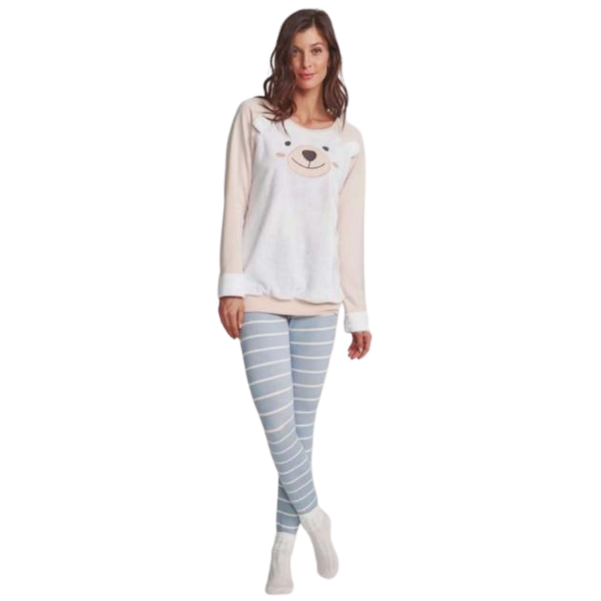 Pijama com legging listrado e blusa em moletinho com aplique de urso peluciado na parte frontal, além de gostoso esse pijama é um charme!