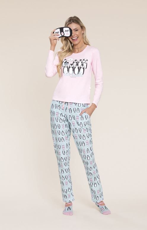 Este pijama de estampa de pinguins e urso, meiga e delicada, de cores suaves, compõe um look jovial e divertido. Seu tecido leve de algodão, traz conforto e maciez.