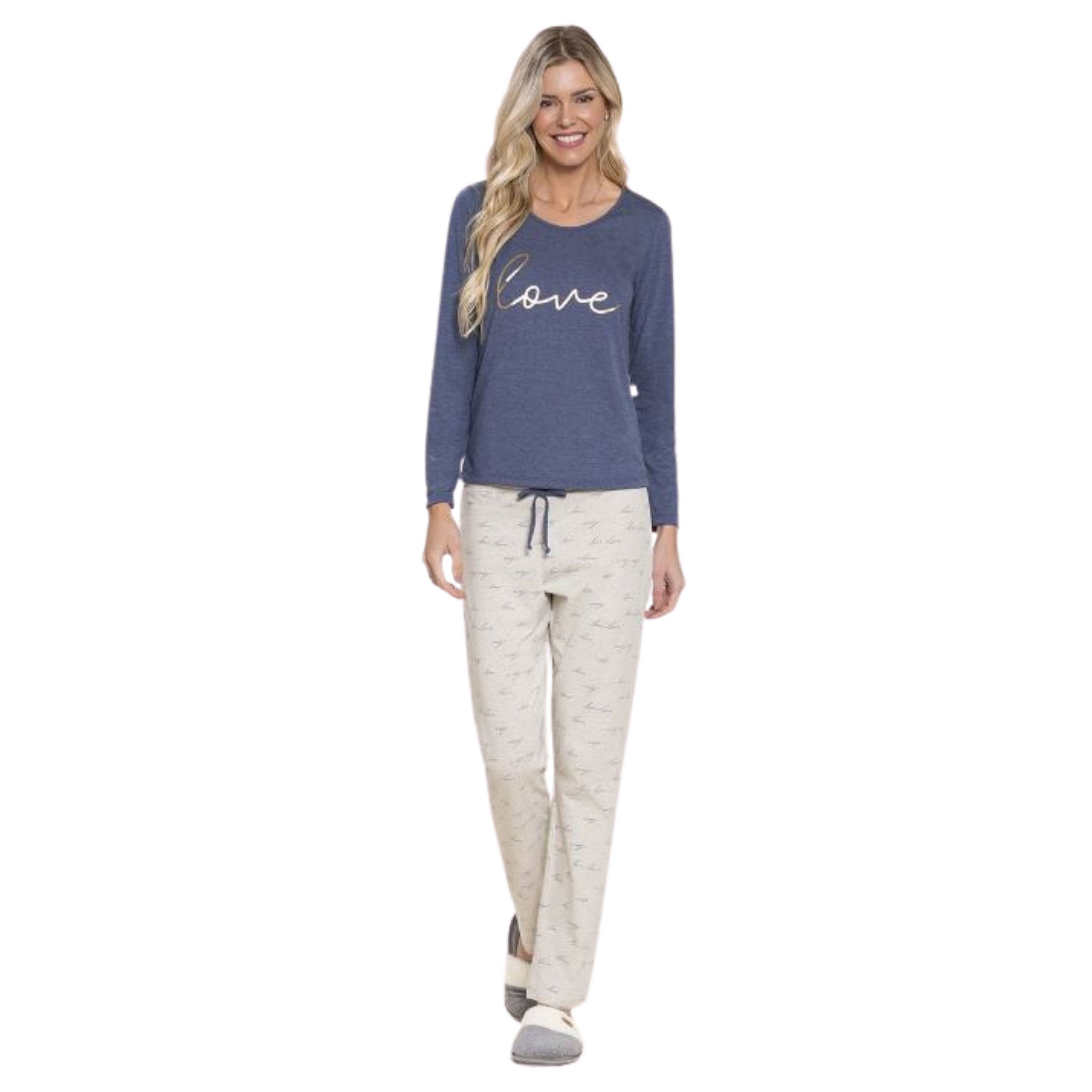 Esse pijama é aquele macio e tão bonito que você não vai querer tirar! Blusa de manga longa e deote redondo na cor jeans e calça mescla com estampa escrita love.