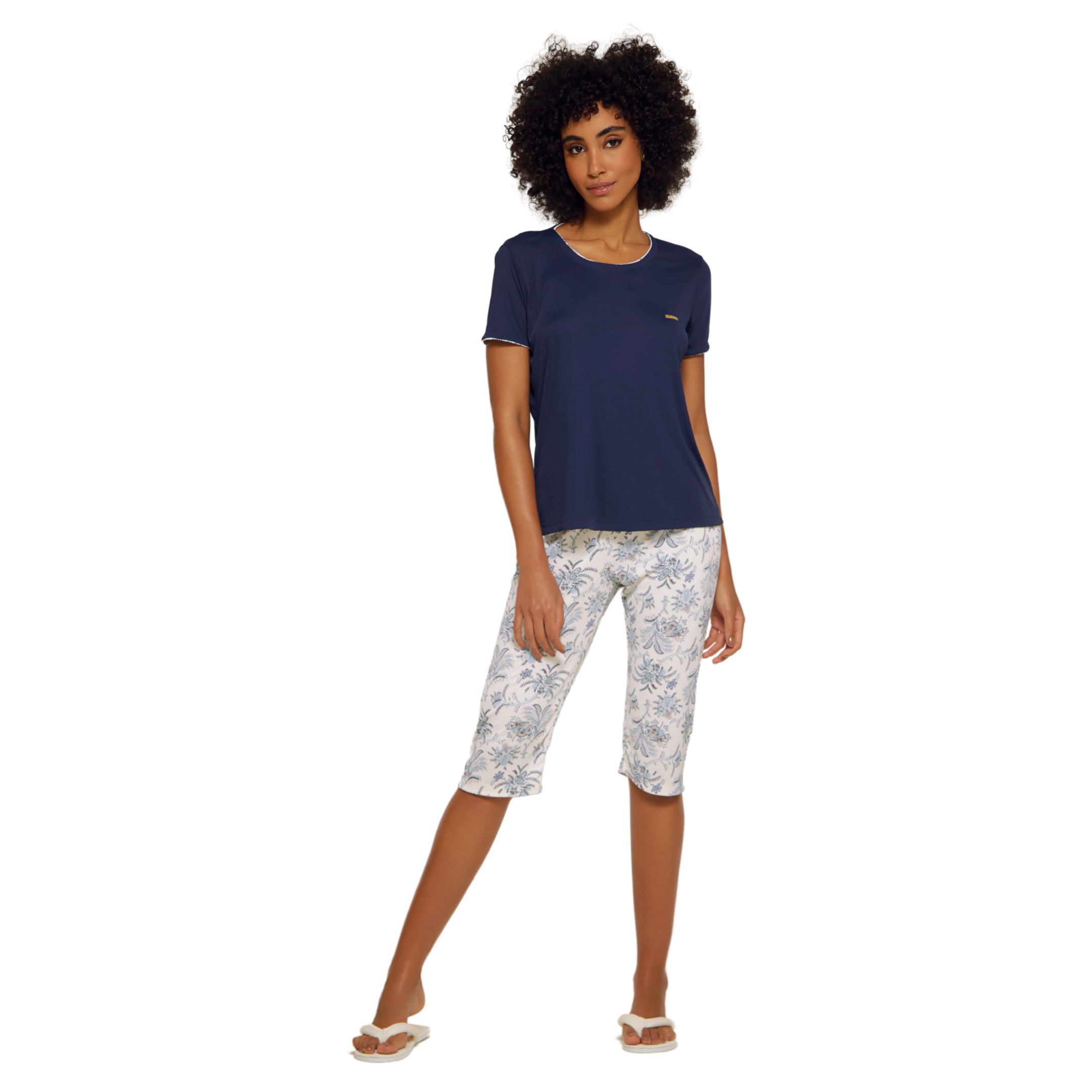 Chique e confortável. Pijama em liganete de poliamida. Camiseta lisa azul marinho, com friso interior estampado, gola circular. Calça pescador liganete com estampa floral delicada.