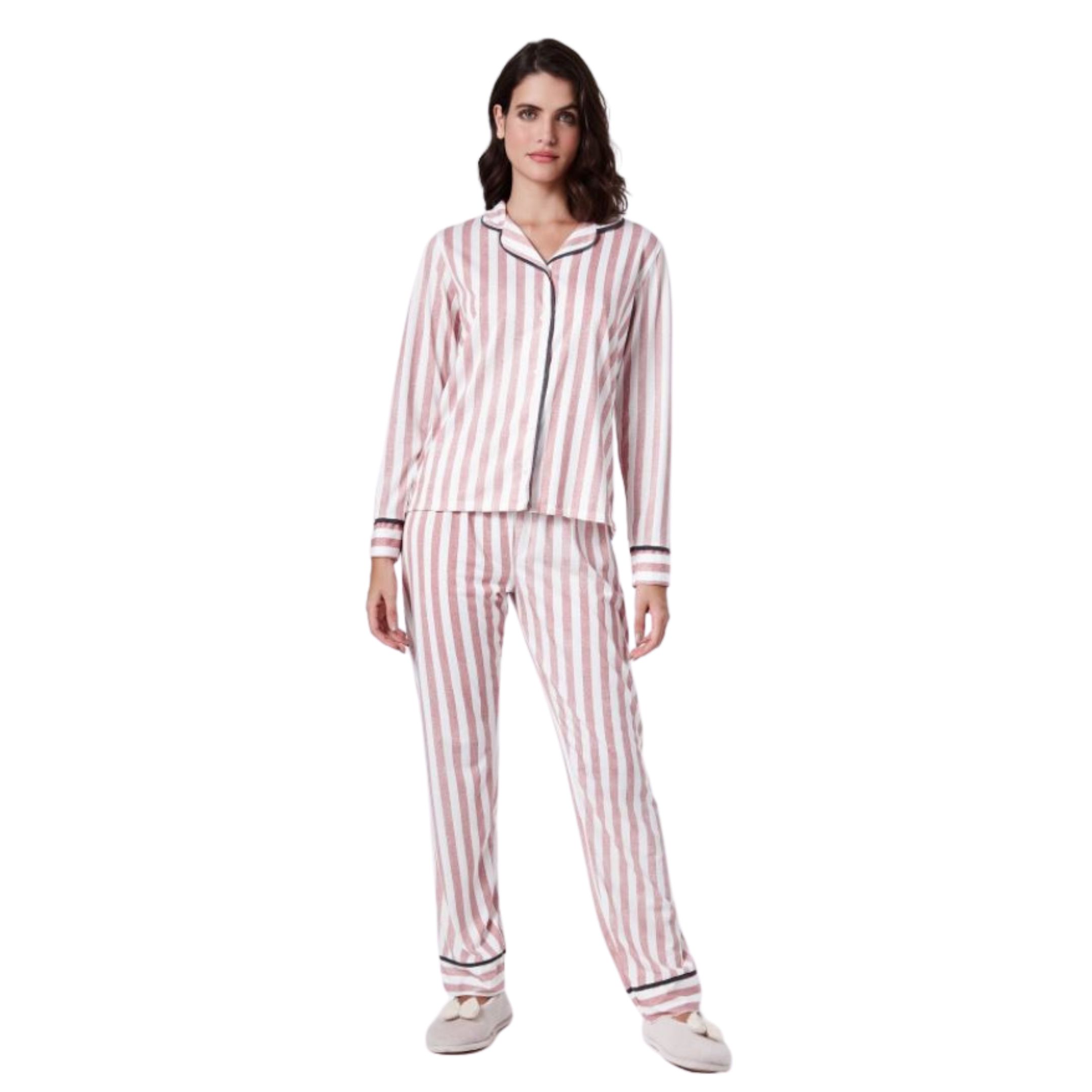 Esse pijama de listras, veio na cor rosa queimado e rosa, em malha leve e macia. Modelo americano de visual moderno, fez dele um sucesso de vendas.