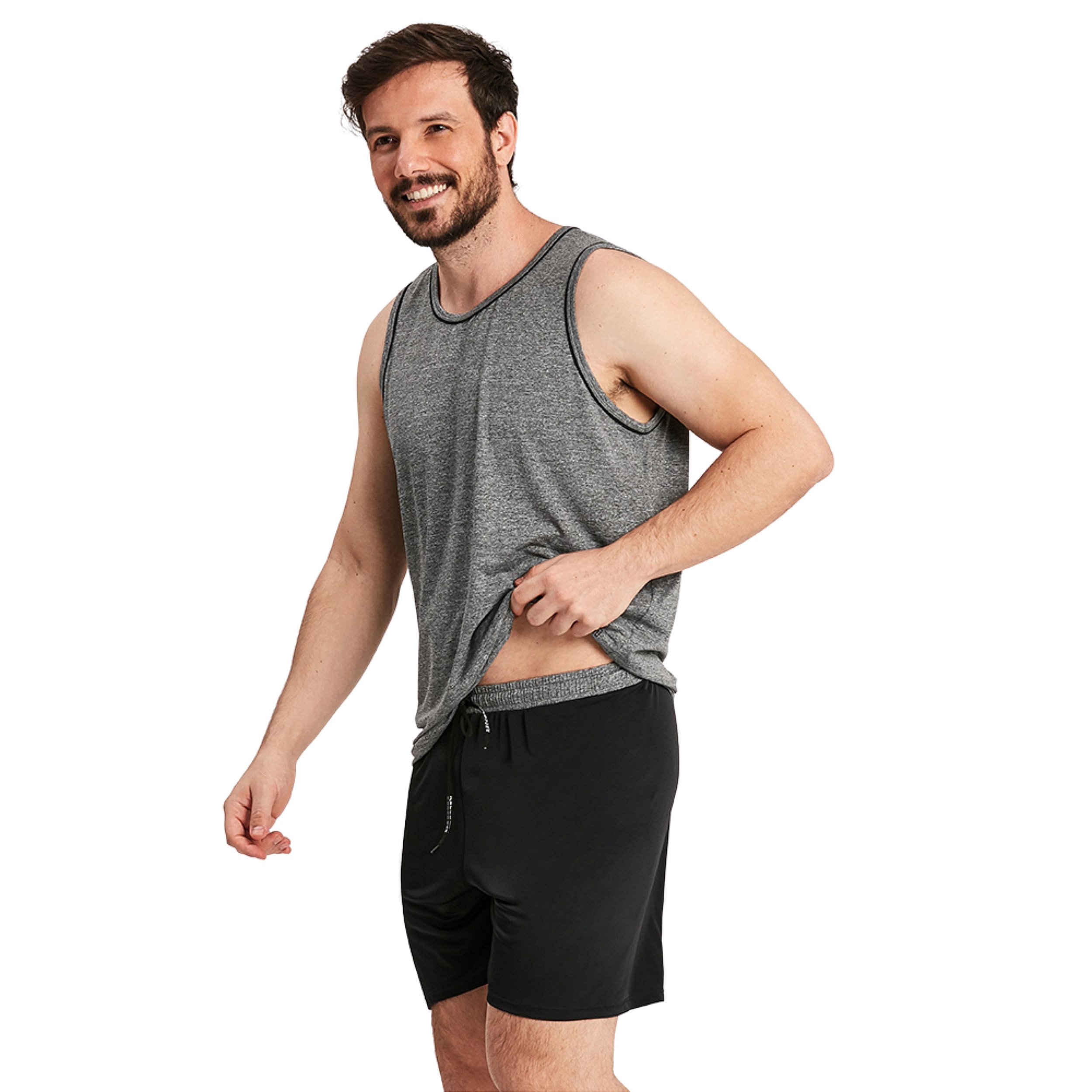 Confeccionado com tecidos de alta qualidade, esse pijama masculino Recco une com perfeição conforto e modernidade. Composto por camiseta regata e short, o conjunto é feito com poliamida Microdry e microfibra Amni, dois materiais extremamente resistentes e com tecnologia de alta performance. Os detalhes com faixas de cores contrastantes no decote, na cava da regata e no elástico do short deixam o pijama com um ar mais esportivo.