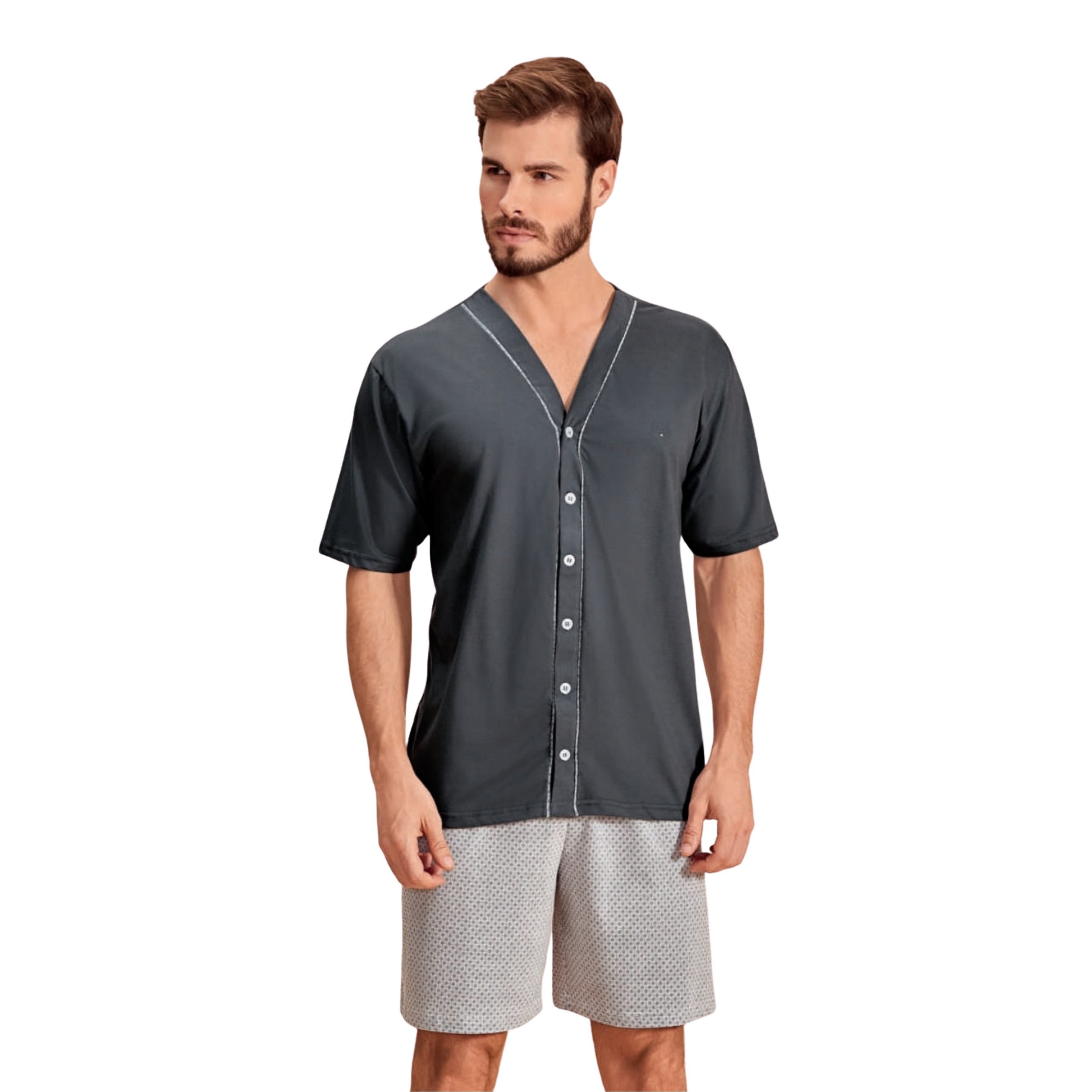 Pijama em algodão macio, com shorts e blusa com botões de manga curta na cor cinza chumbo. A abertura facilita na hora de vestir.