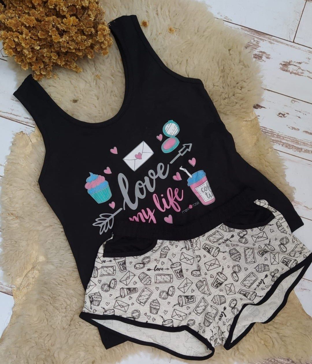 Pijama jovial, gostoso e fresquinho, seu shorts estampado com desenhos de copo de café, envelopes, corações e cupcakes é um sucesso, e combina perfeitamente com sua regata preta em algodão.